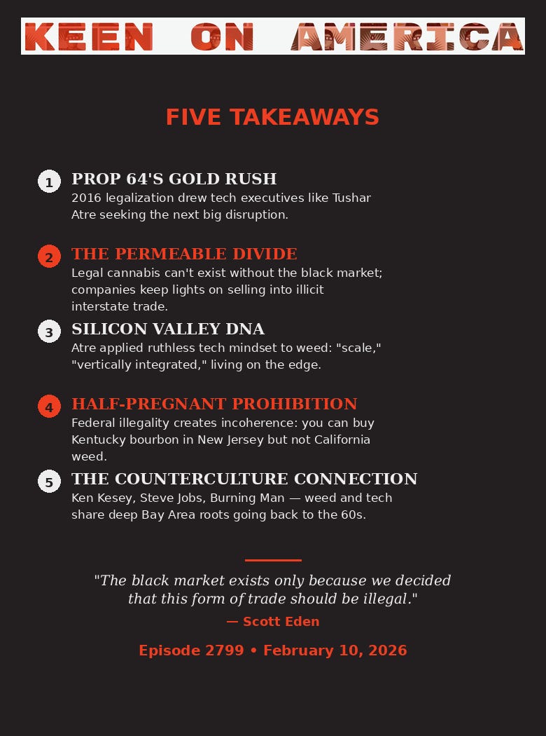 In October 2019, Californian tech executive Tushar Atre was abducted from his Santa Cruz oceanfront home and found murdered on his own property in the redwoods — shot execution-style, hands bound. The serial entrepreneur had spent barely three years in the cannabis business. Investigative journalist Scott Eden’s new book, A Killing in Cannabis, traces how a charismatic Silicon Valley innovator, seeking to “disrupt” the newly legal weed industry, found himself entangled with a cast of eccentric and violent characters — hippie do-gooders, black-market operators, and, surprise surprise, professional killers. We discuss the murky zone between legal and illegal cannabis, why this supposedly booming industry has been such an economic disaster for most founders, and whether America’s half-pregnant approach to legalization created the conditions for Tushar’s death. While Santa Cruz isn’t quite in Silicon Valley, this is nonetheless a quintessential tech bro parable about the darkness of the American dream.