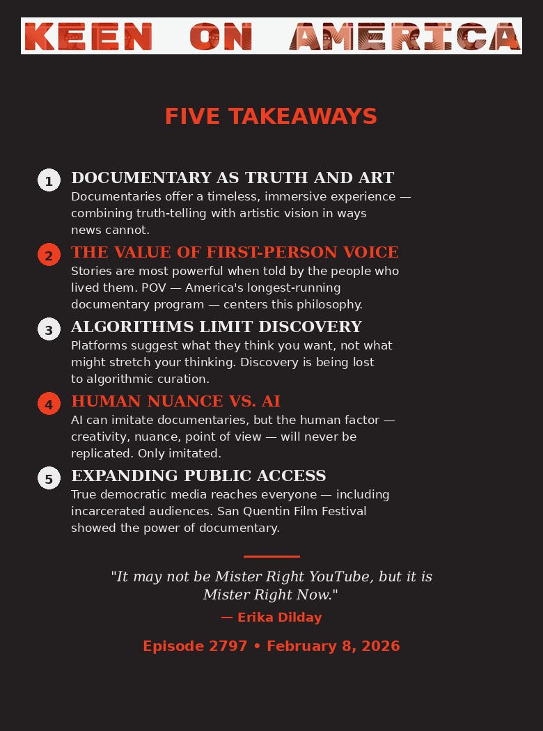 On Super Bowl Sunday — with America radically divided over the meaning of its 250th anniversary — Erika Dilday came on the show to discuss the power of documentary film to tell the truth about the United States. As executive producer of PBS’ POV (point of view), the longest-running documentary program on American television (now entering its 39th season), Dilday has spent her career championing first-person storytelling. She’s also co-directing an upcoming series with Ken Burns, Emancipation to Exodus, exploring the period from the Civil War to the Great Migration. We discuss why algorithms limit discovery, whether AI can replicate human nuance in documentary movies, and what she learned from screening films at San Quentin. And she tells us her Super Bowl POV which, coming from a Bostonian, should be no surprise.