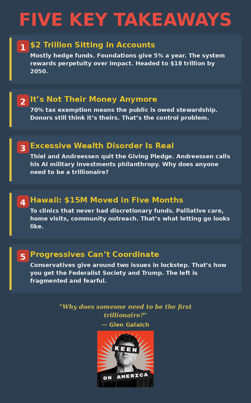 Excessive wealth disorder. It sounds like a disease — which, at least according to Glen Galaich — CEO of the Stupski Foundation and author of Control: Why Big Giving Falls Short, it is. There’s $2 trillion sitting in American charitable accounts Galaich says, mostly invested in hedge funds and real estate. Foundations are legally required to distribute only 5% a year — the bare minimum — and invest the remaining 95% to ensure they can make that back and live forever. The system rewards perpetuity over impact. The money is stuck — like most other things in America. And this philanthropic wealth is predicted to grow to $18 trillion by 2050 — twice the size of the annual federal budget. A truly excessive wealth disorder.