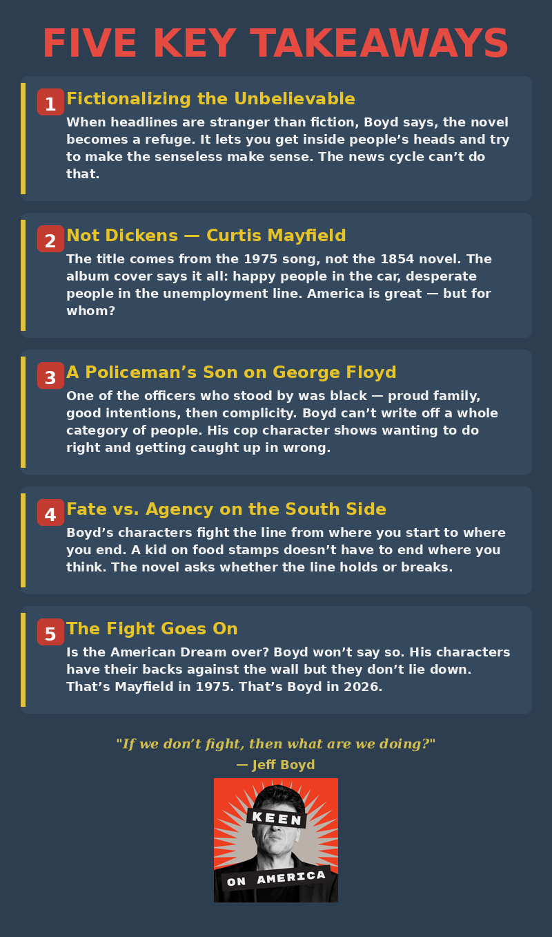 Is the American Dream over? Did it ever exist? Boyd isn’t quite sure. “As much as it feels impossible,” he says, “some part of me always wants to believe.” His characters fight — backs against the wall, cards stacked against them, but they don’t give in. Very Chicago. That’s what Curtis Mayfield was singing about in 1975 and it’s what Jeff Boyd is writing about in 2026. The times are hard. A time, once again, for novelists to seize back reality.