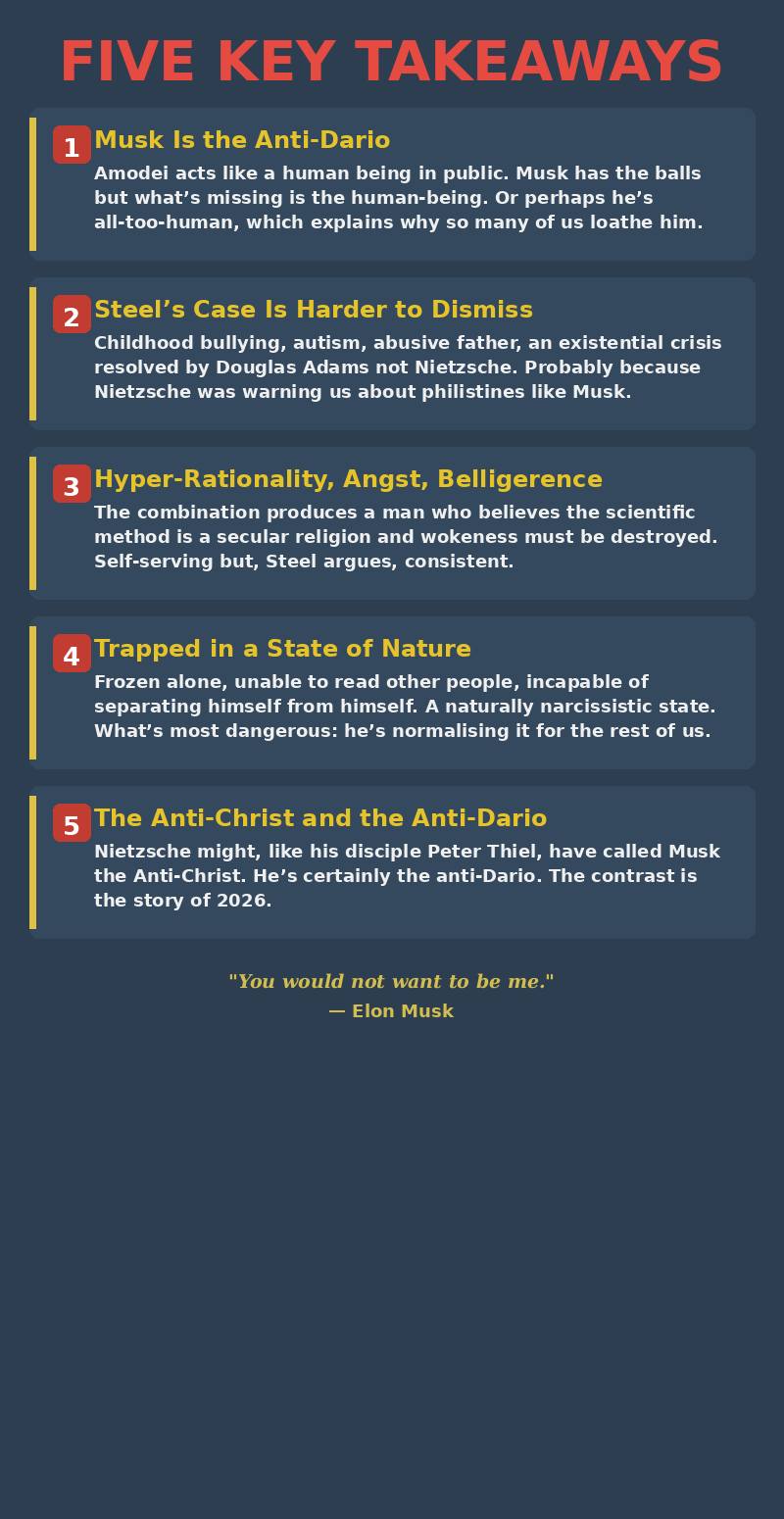 I suggested to Steel that Musk is trapped in a Hobbesian state of nature — frozen alone, unable to read other people, incapable of separating himself from himself. A kind of naturally narcissistic state. This is what I most dislike about Elon. That he’s normalizing this state of nature. Nietzsche might (like his contemporary disciple Peter Thiel) have called him the Anti-Christ. He’s certainly the anti-Dario.