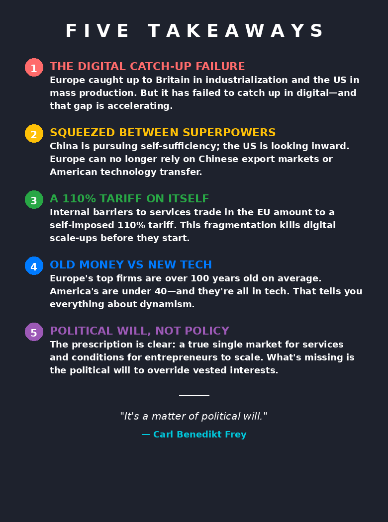 Yesterday’s show from the DLD conference was about the need for Europe to relearn the language of power. Today, things get even more dire for our European friends. I asked another DLD speaker, Carl Benedikt Frey, a Swedish economic historian who teaches at Oxford, whether it’s “game over” for Europe in terms of its ability to compete with American and Chinese big tech. His answer: not yet—but close. Frey’s last book, shortlisted for the 2025 Financial Times business book of the year, is entitled How Progress Ends: Technology, Innovation and the Fate of Nations. But it’s specifically Europe’s economic progress and the fate of European nations that most concerns Frey. Unless Europeans create a true single market for services, he warns, it really could be the end of the European dream of continent-wide progress. So no more crossroads for a continent perennially at a crossroads. And that single market, Frey explains, is ultimately a matter of political rather than economic will.