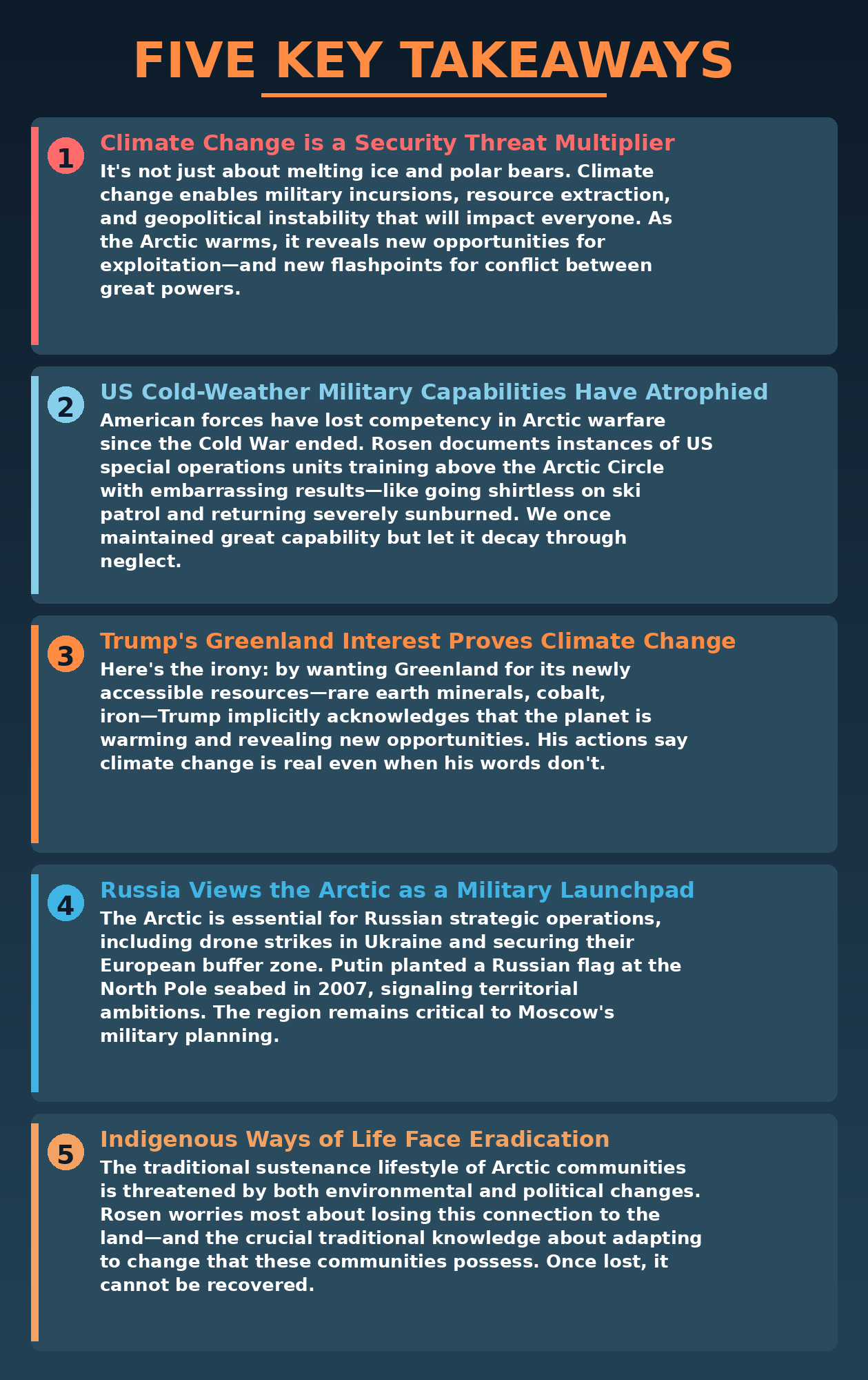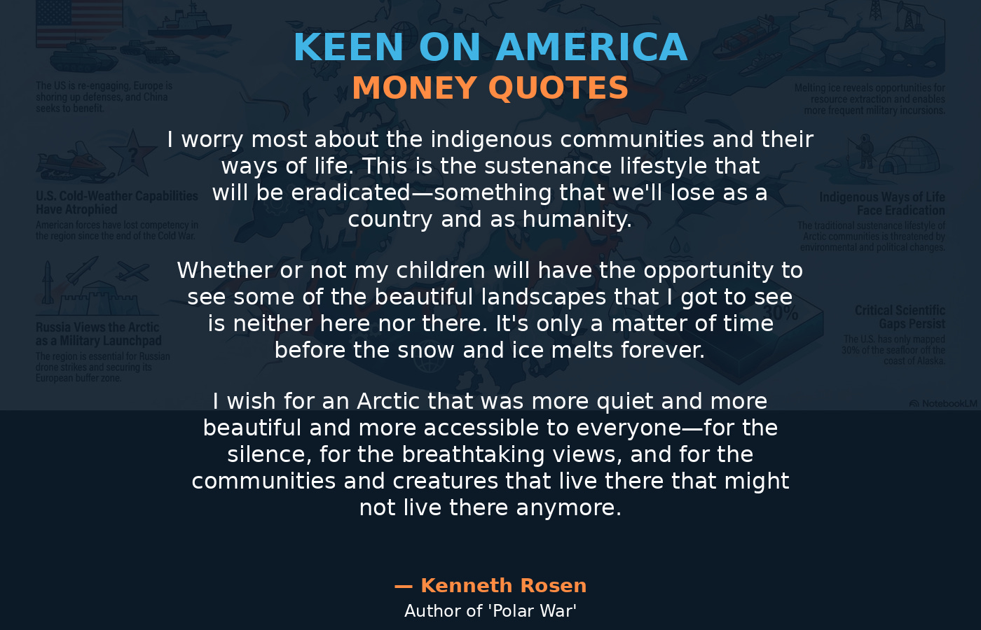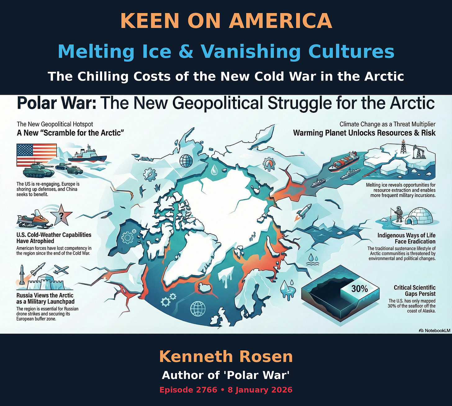 Timing is everything. The versatile American journalist Kenneth Rosen was last on the show in early 2021 talking about troubled teens. Since then, Rosen has travelled extensively in the Arctic and has just published Polar War, a narrative about the chilling costs to both America and the world of the new Cold War in the Arctic. Timing is, indeed, everything, especially in the book business. But Rosen’s travelogue of melting icecaps and vanishing indigenous cultures offers an alternative take on the media’s current geo-strategic obsession with Greenland. "I worry most about the indigenous communities and their ways of life. This is the sustenance lifestyle that will be eradicated—something that we'll lose as a country and as humanity,” Rosen warns. “It's only a matter of time before the snow and ice melts forever." And when it’s gone, it’s gone. Then timing will be nothing.