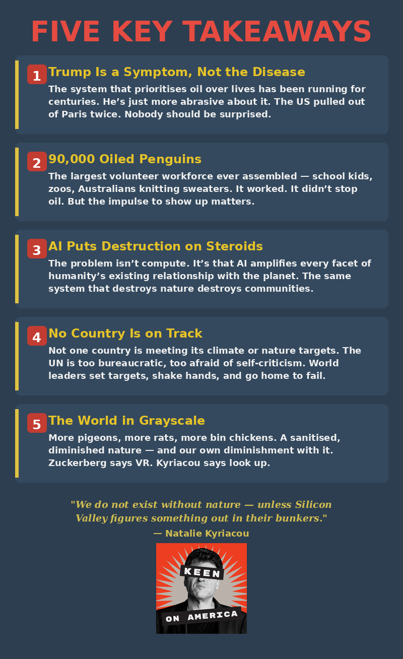 Forget the Middle East for a moment. Or rather, don’t — because today’s petroleum war is an environmental catastrophe, perhaps even an ecocide. Militaries are the largest source of emissions on the planet. Trump uses Iran’s oil fields as a bargaining chip while assassinating its leaders, as if the price of petroleum is more important than human life (which it clearly is to him). Natalie Kyriacou, an Australian environmentalist and author of Nature’s Last Dance, isn’t surprised. Trump, she says, is the symptom rather than the disease. His rotten system of prioritising oil over human lives has been ruining the planet now for over a century. He’s just less polite about it.