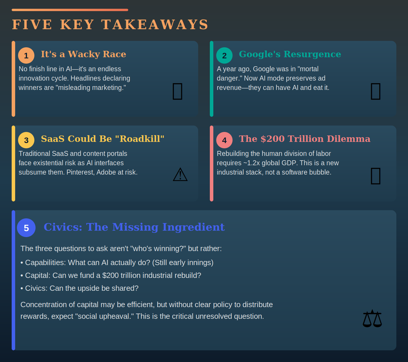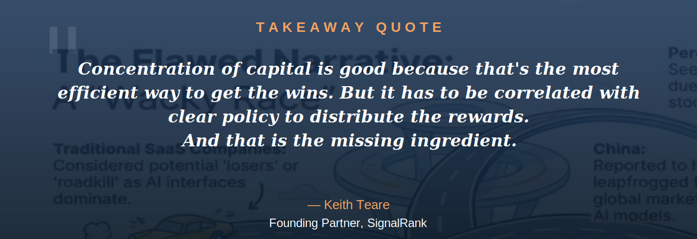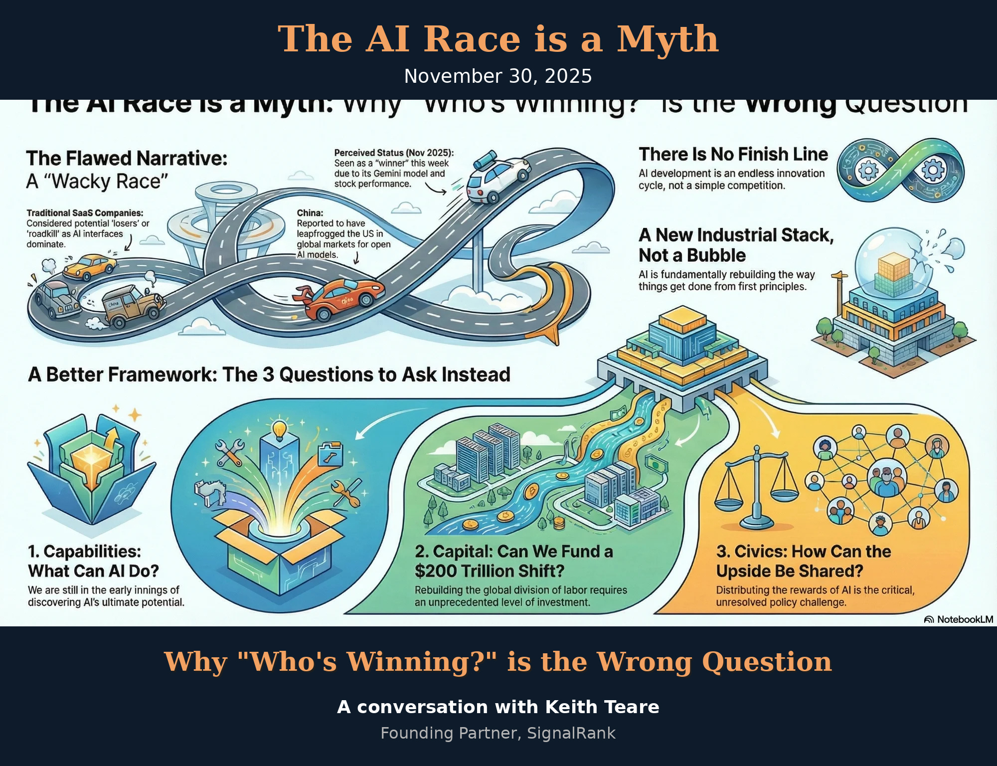 Who’s winning and losing in AI plays like a wacky race in that every week there seems to be a new leader. But that’s actually the wrong way of thinking about today’s AI revolution. The right questions are about the three Cs: Capability, Capital and Civics. That’s the lesson of Keith Teare’s latest That Was The Week tech newsletter which focuses on what he calls “the Year in Intelligence”. Nobody is winning the AI race, Teare argues, because it isn’t a race. Instead, it’s an endless innovation cycle without either a start or finish line. The three key questions are whether AI capabilities are solving real social and economic problems, whether we can fund a $200 trillion industrial rebuild, and whether the rewards can be equitably shared. Those are the questions we should be asking. Not who is winning or losing.