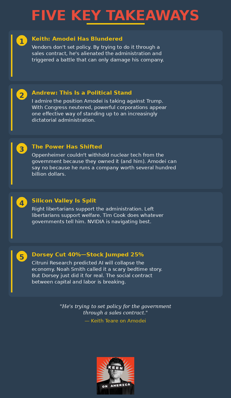 Keith’s argument is simple: vendors don’t set policy. If you want to sell to governments, you can’t then control what they do with your product. That’s not your role. And by trying to dictate government policy, Amodei has managed to alienate the entire US administration and triggered a battle that can only damage his company. I’m much more sympathetic. I admire the political position Amodei is taking against Trump. With Congress neutered, powerful corporations appear one effective way of standing up to an increasingly dictatorial administration.
