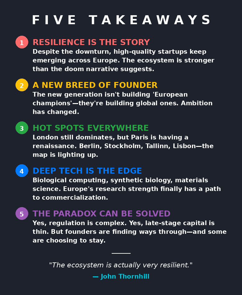 This is the final conversation from DLD. And the most optimistic - at least from a European perspective. John Thornhill, the FT’s Innovation Editor and founder of Sifted, has a quite different take on Europe’s tech scene from our other guests. Yes, he acknowledges, the regulatory environment is complex. And, yes, late-stage capital is thin. But Thornhill sees something the doomsayers miss: resilience. A new generation of founders isn’t building “European champions” — they’re building global ones. Innovation hot spots are popping up across the continent: London, Berlin, Stockholm, Tallinn, Lisbon. Paris (of all places) is enjoying a renaissance. And deep tech — biological computing, synthetic biology, materials science — may finally give Europe’s research strength a viable path to commercialization. So who needs Silicon Valley Goliaths when you have an army of European Davids?