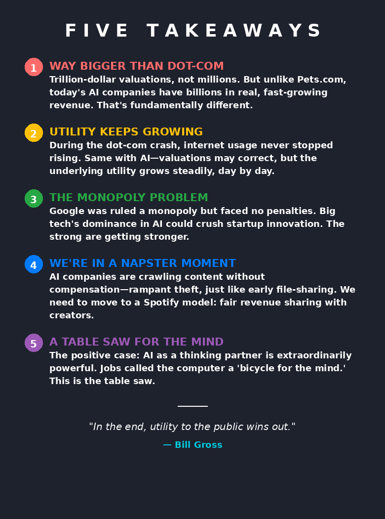 Few people experienced the Dot-Com bubble with more vertiginous intensity than Bill Gross, the Pasadena-based founder of Idealab and many many other internet startups over the last 30 years. So when I sat down with Gross at DLD, I couldn’t resist opening with the boom/bubble gambit. How, I asked him, does today’s AI hysteria compare with the Web 1.0 madness of the Nineties? While Gross - whose current ProRata.ai play is focused on protecting creativity in the age of generative AI - doesn’t believe that today’s boom is akin to the Dot-Com bubble, there are similarities. We are at what Gross calls a “Napster moment” in terms of making the big LLMs accountable for all the content they are illegally crawling (ie: stealing). And to get beyond this moment, he says, everyone from Google and OpenAI to Perplexity and Anthropic, needs to move to a “Spotify model” that fairly shares revenue with the human creators of knowledge.